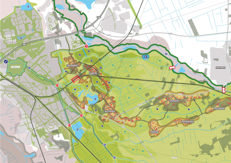 Het herstel van de historische Vechtarm zorgt voor een verbinding tussen de Sallandse Weteringen en de rivier. Op de hogere zandgronden wonen mensen veilig in hogere dichtheden. In de lager gelegen rivierkomgronden daarentegen leven mensen amfibisch in een nieuw gecreëerd doorstroom-moeras. De omgeving zorgt voor de mensen en de mensen zorgen voor de omgeving.