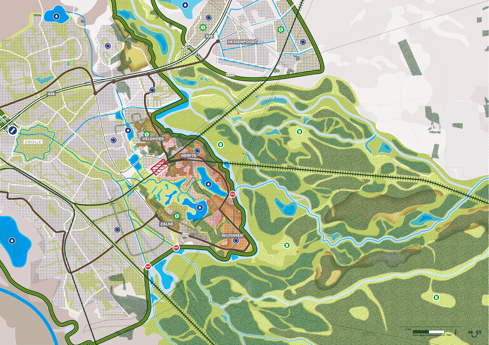 Door ingrepen in het landschap kunnen wilde dieren het overnemen. Grote grazers vinden hun weg terug en onderhouden een dynamisch en zelfregulerend ecosysteem. De Vecht en de waterlopen worden vrijgelaten en volgen hun eigen koers. Achter de superdijk heeft Zwolle zich ontwikkeld tot een moderne metropool van wereldformaat, waar nieuwe woon- en werkmilieus hightech productie en wonen combineren. De stad zorgt voor zichzelf. Treinen schieten door de wildernis naar andere steden via een pijlerinfrastructuur.