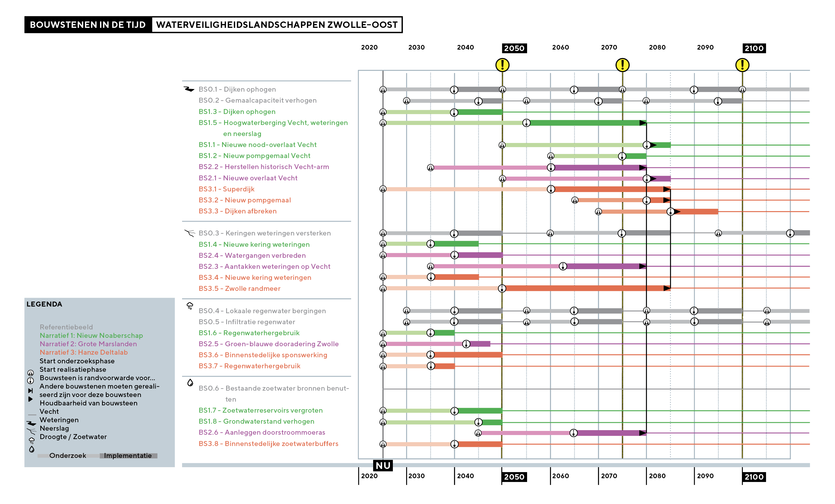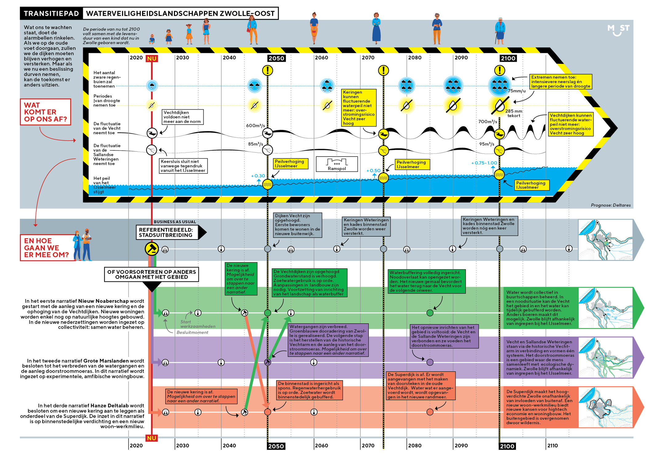 Wat komt er op ons af? De deltascenario’s en prognoses van Deltares geven antwoord op deze vraag. In Zwolle–Oost hebben we te maken met een steeds intensievere dynamiek in het watersysteem. Tegelijkertijd neemt de tegendruk van het IJsselmeer toe door een verhoogd waterpeil dat meebeweegt met de zeespiegel. De jaren 2050, 2075 en 2100 markeren hier beslissende momenten. Hier gaan de alarmbellen rinkelen. Als we op de oude voet doorgaan en in dit gebied een stadsuitbreiding bouwen, wordt Zwolle-Oost een landschap met steeds hogere dijken en een ingewikkeld systeem van gemalen (zie 0–scenario Business as usual hierboven). Het transitiepad heeft niet als doel om één van de eindbeelden te selecteren en daar naartoe te bewegen, maar toont vooral aan dat wanneer we nu voorsorteren op een andere aanpak van het gebied, er alternatieve toekomsten mogelijk zijn.