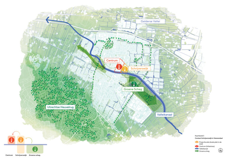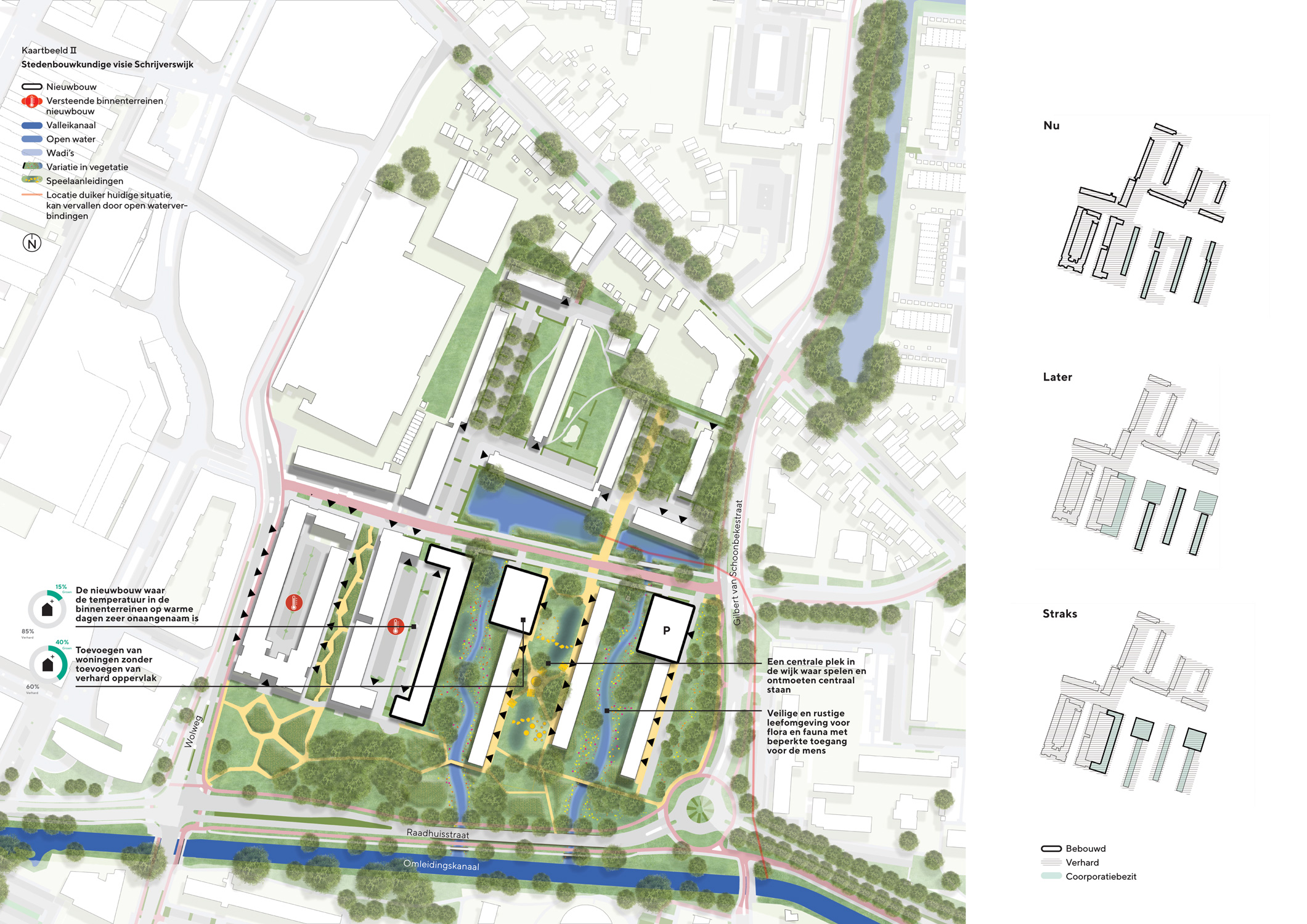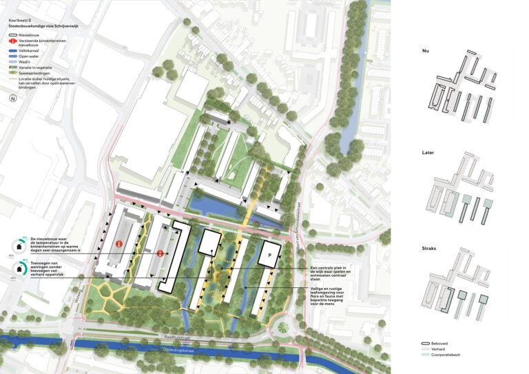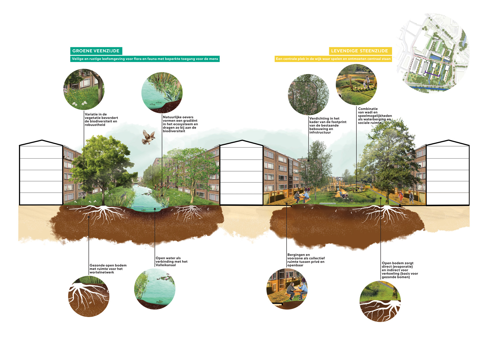 Onze ontwerpvisie is geworteld in het geloof dat de stad een gedeeld project is. Door de leefomgeving en al haar bewoners met elkaar te verbinden, maken we ruimte voor een ‘nieuwe tijd’. Een tijd waarin we plekken maken waar het welzijn van planten, dieren en mensen centraal staat. In ons ontwerpvoorstel opperen we daarom om de openbare ruimte van Schrijverswijk te transformeren tot ‘openbare ademruimte’: een plek die verkoelt, water vasthoudt en biodiversiteit versterkt — en een plek die ontmoeting stimuleert. We verdichten louter daar waar al gebouwen staan en waar zich al verharding bevindt. Zo herwaarderen we de aanwezige kwaliteiten van Schrijverswijk: groen niet opgeofferd, maar juist versterkt. In ons ontwerpvoorstel maken het watersysteem zichtbaar en zorgen dat het ecologisch verbonden wordt met het Valleikanaal. Zo ontstaat een robuuste, toekomstbestendige wijk als schakel tussen het versteende centrum en de groene scheg van Veenendaal.