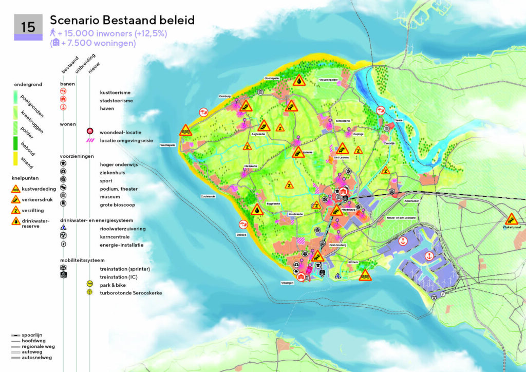 Hiervoor maakten we een ruimtelijke analyse van het gebied en onderzochten we de bandbreedtes aan leefmilieus die daarbij horen. Deze analyse vertaalden we naar drie groeiscenario’s voor Walcheren met bijbehorend potentieel ruimtelijk beeld.